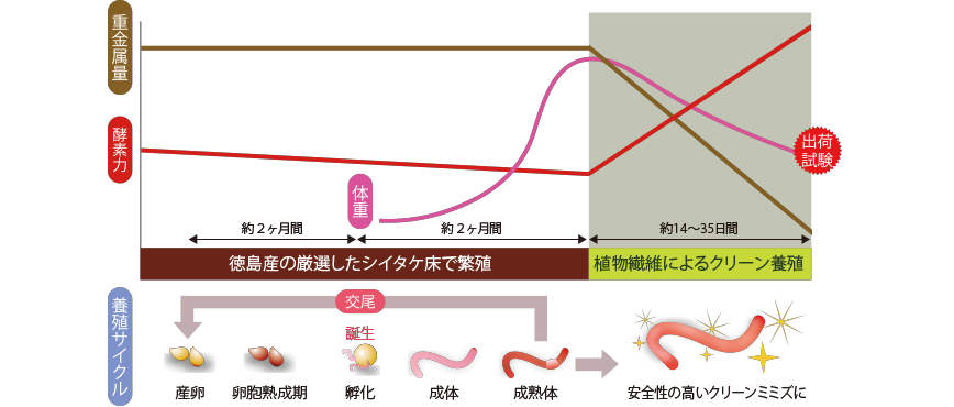 「補巡エンザイム」に使われるミミズは、国内3カ所(宮崎県・奈良県)の拠点で飼育されています。より衛生的なミミズを育てるために開発されたのが、特許取得の「クリーンミミズ飼育法」。厳選された養殖床で繁殖させ、食物繊維を食べさせることで、ミミズ体内の不純物を減らし、従来の飼育法に比べて細菌等を大幅に減らすことができました。 また、飼育時に出る糞土は京都大学農学部に供給し研究題材として再利用されています。